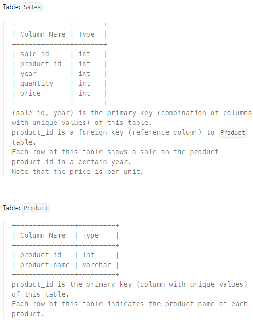 - 1️⃣ 각 프러덕트 별 2️⃣ 최초 판매 연도의 2가지 조건을 만족하는 다중컬럼 서브쿼리로 문제를 해결할 수 있다. 서브쿼리에서 product_id 별로 그룹화해 각 프러덕트별 판매연도의 최솟값(=최초 판매 연도)에 해당하는 데이터를 구해 해당 데이터와 일치하는 데이터만 필터링한다. 나는 서브쿼리 출력 결과 컬럼명도 맞춰줬는데 다른 사람의 쿼리를 보니 컬럼명까지 동일하게 할 필요는 없다