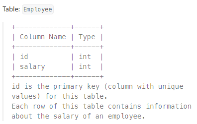 - WHERE문에서 서브쿼리를 활용해 Employee테이블에서 salary의 MAX값이 아닌 데이터만 필터링하고(=최고 급여 데이터 제외), 메인쿼리 SELECT문에서 다시 MAX값을 구해(=첫 번째로 높은 급여는 제외되었으므로 2번째로 높은 급여가 출력됨) 출력 컬럼명에 맞춰 출력한다