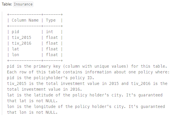 - WHERE절 서브쿼리와 IN을 활용해 tiv_2015, lat, lon 조건을 만족하는 데이터를 필터링해주었다. 먼저 tiv_2015 값은 1명 이상의 다른 보험 계약자와 중복되어야 하므로 WHERE문 서브쿼리에서 tiv_2015값으로 GROUP BY한 뒤 그룹의 행 개수가 2개 이상인 tiv_2015 를 가지는 데이터만 필터링해주었다